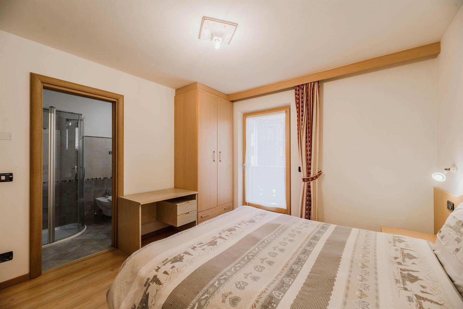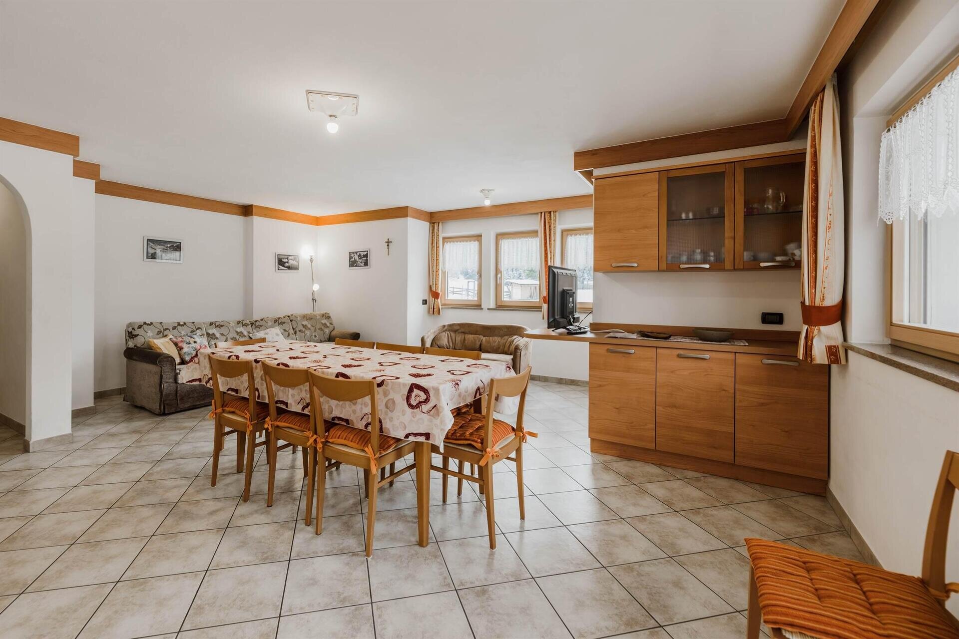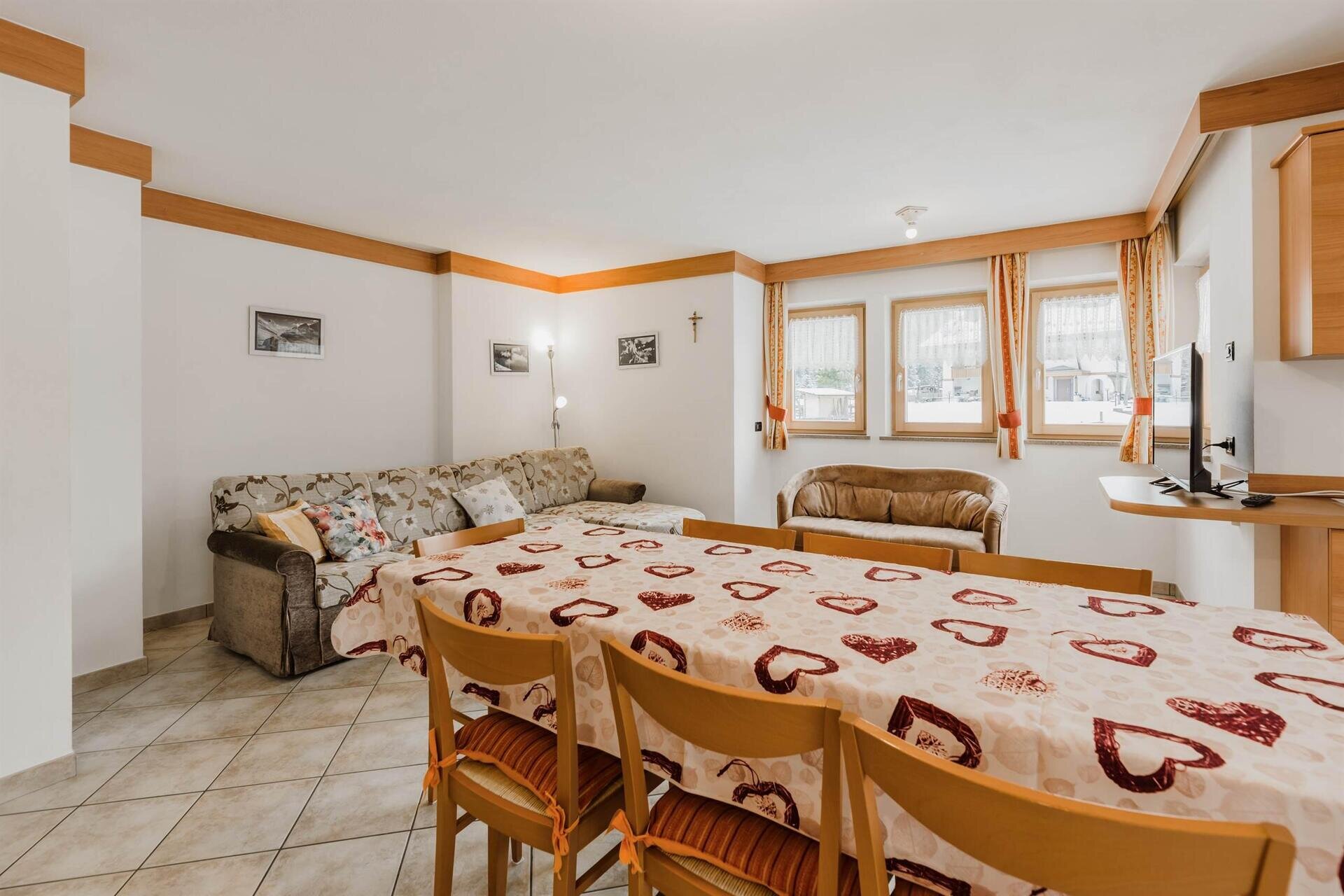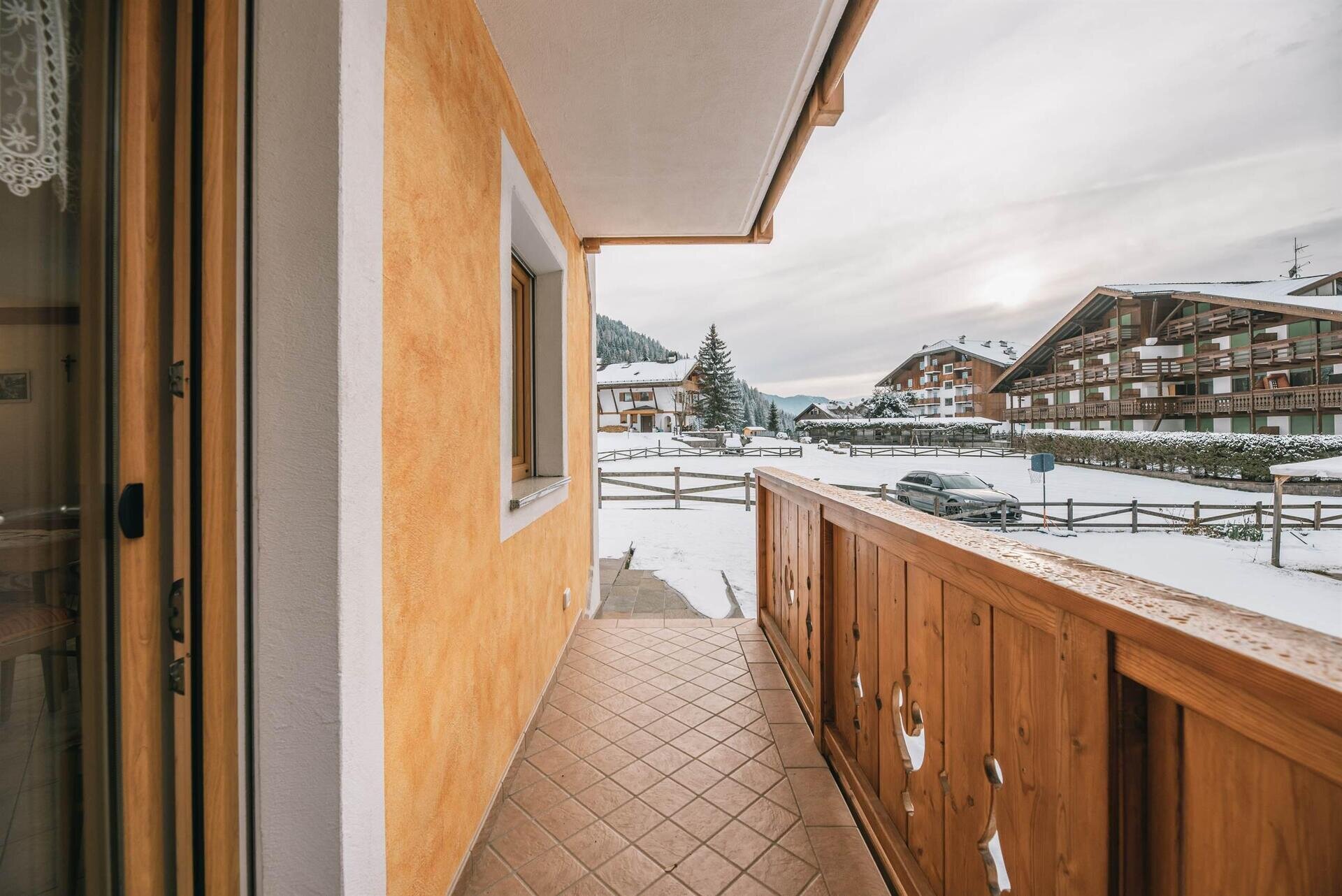 L'appartamento "Soreie" si trova lungo la bellissima Via Meida, in posizione soleggiata e panoramica, rientrato rispetto alla strada. Dal lato sud si ammirano Cima Undici e Cima Dodici, il bosco e la pista dell'Alloch che di notte viene illuminata. Dal lato nord si ha una splendida vista sul Gruppo del Larsech e sul Sassolungo. Dalla casa,