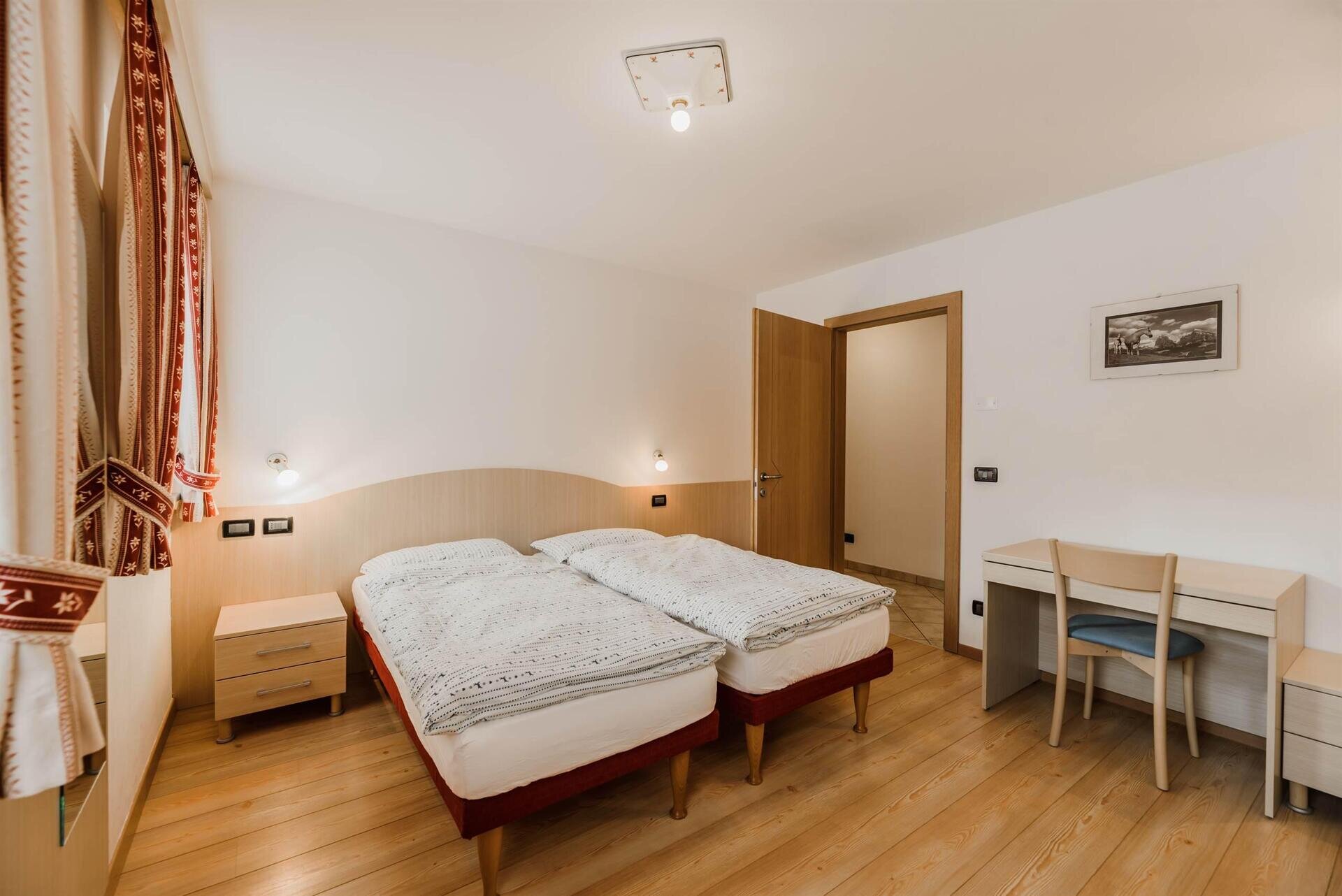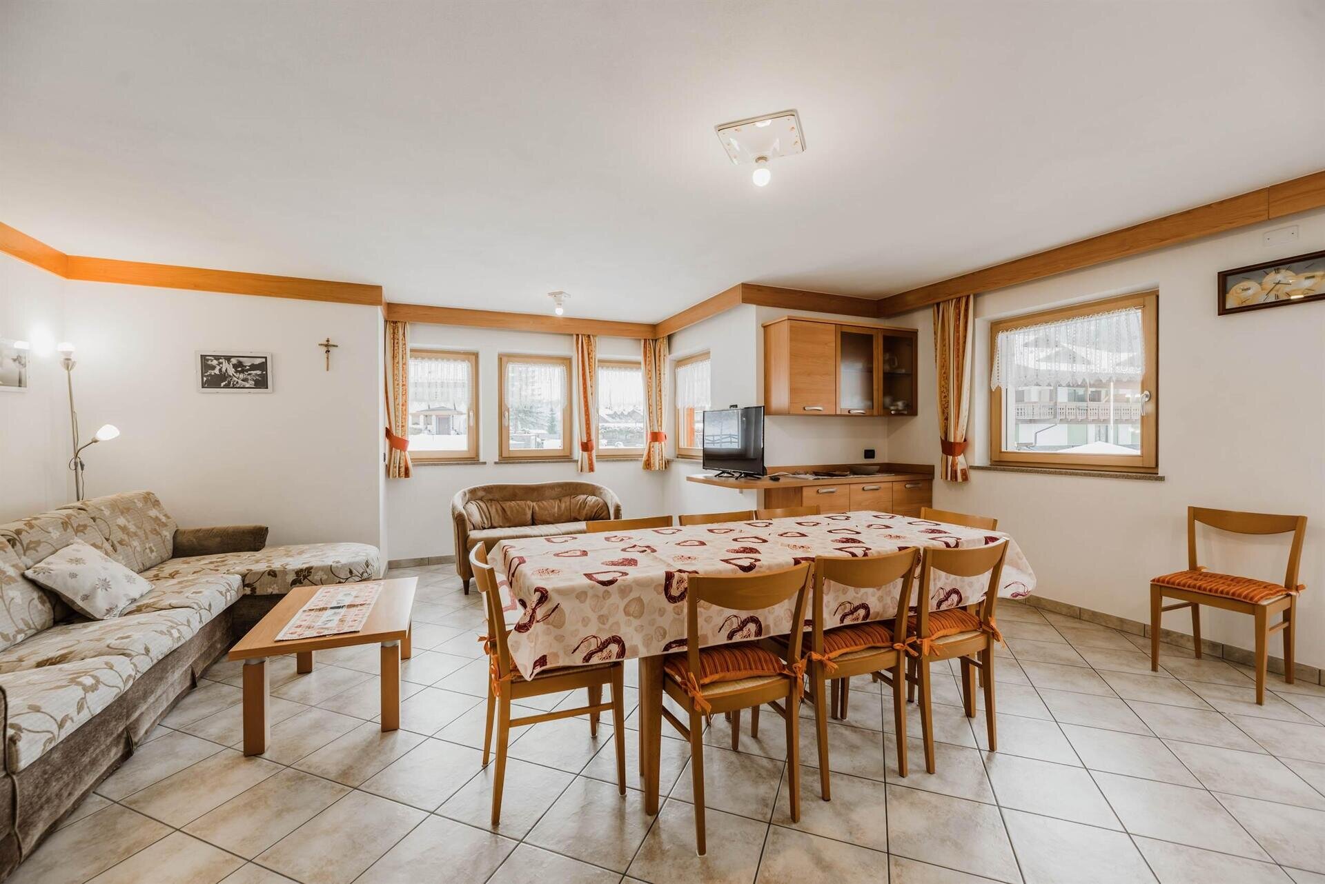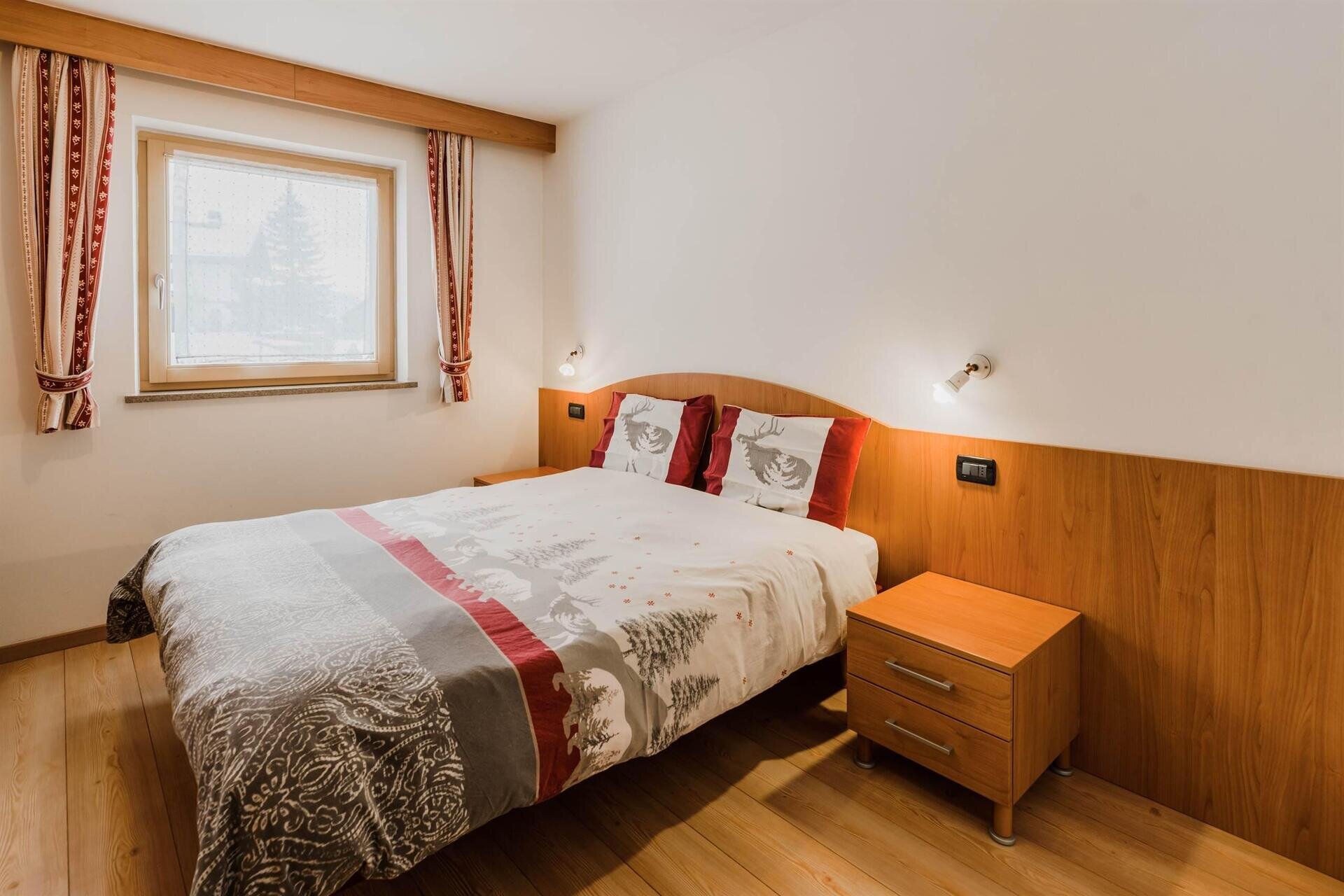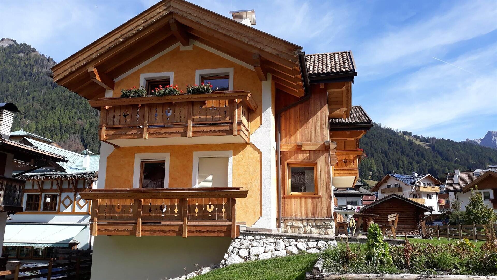 L'appartamento "Soreie" si trova lungo la bellissima Via Meida, in posizione soleggiata e panoramica, rientrato rispetto alla strada. Dal lato sud si ammirano Cima Undici e Cima Dodici, il bosco e la pista dell'Alloch che di notte viene illuminata. Dal lato nord si ha una splendida vista sul Gruppo del Larsech e sul Sassolungo. Dalla casa,