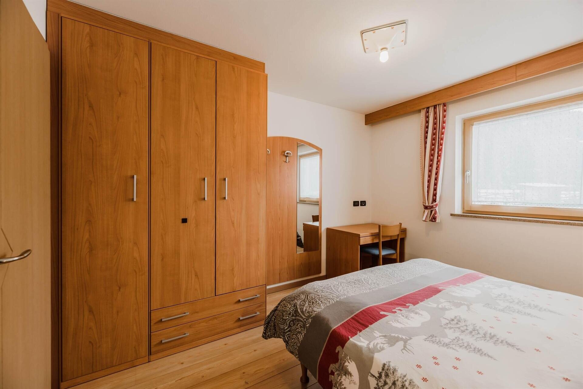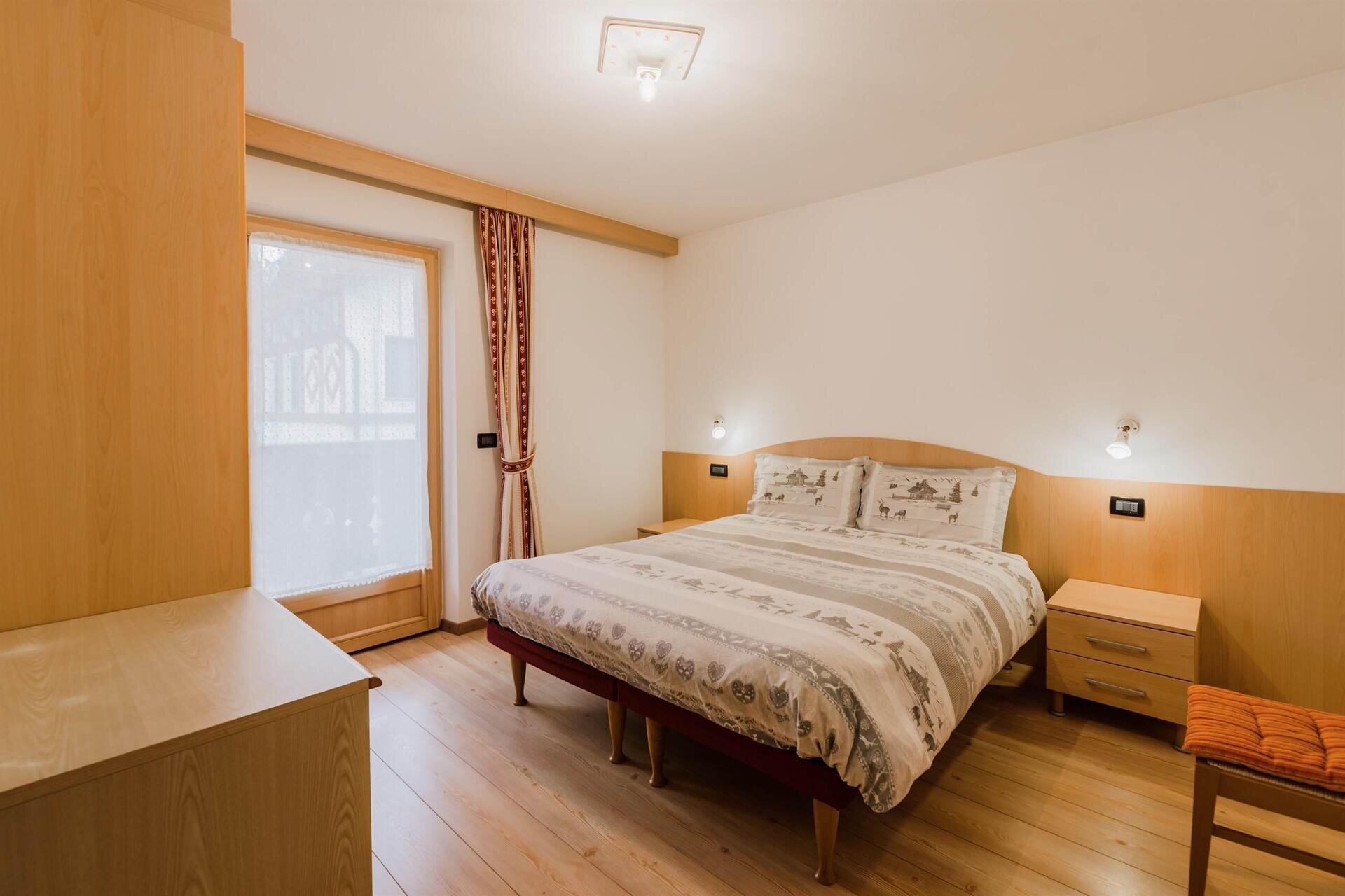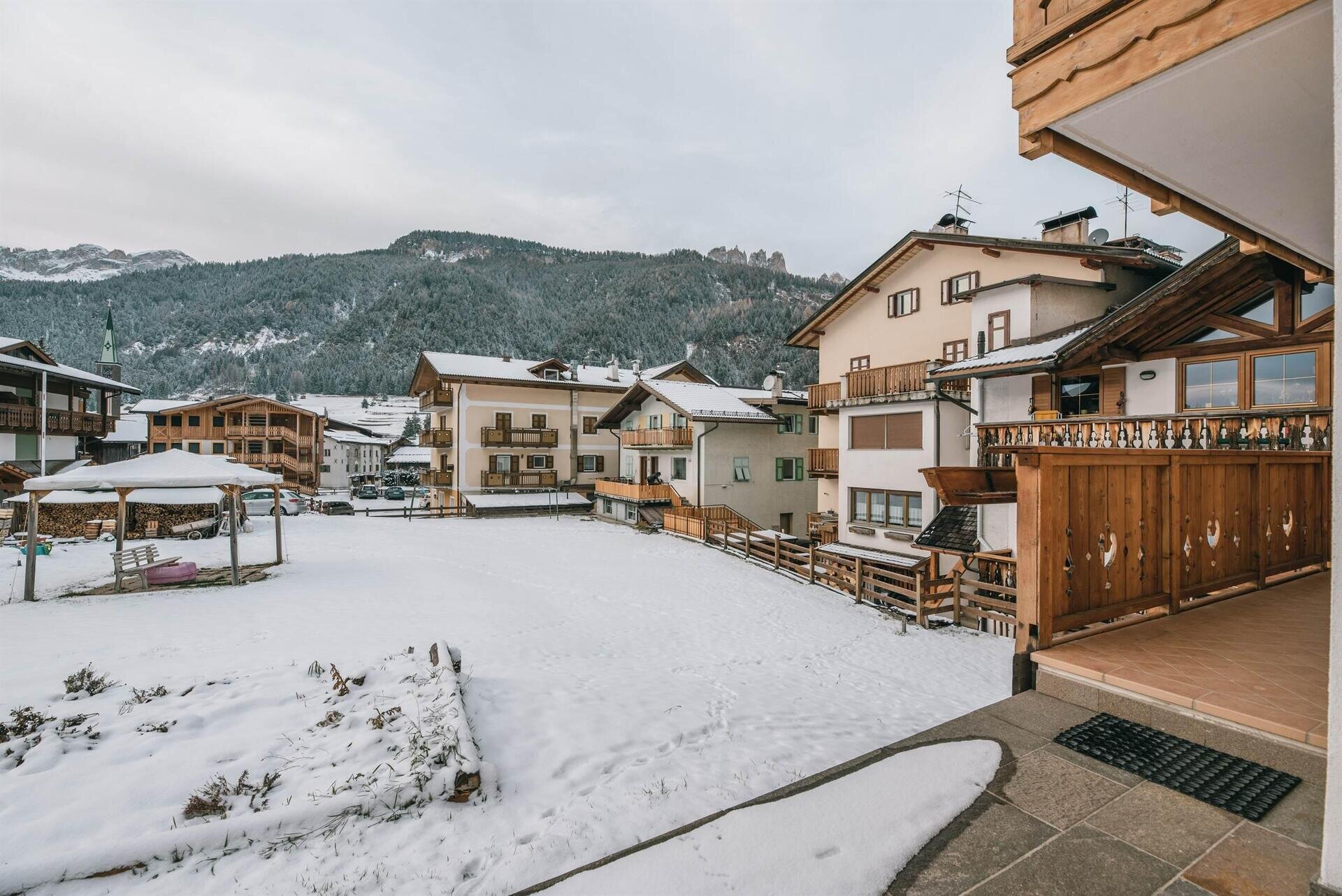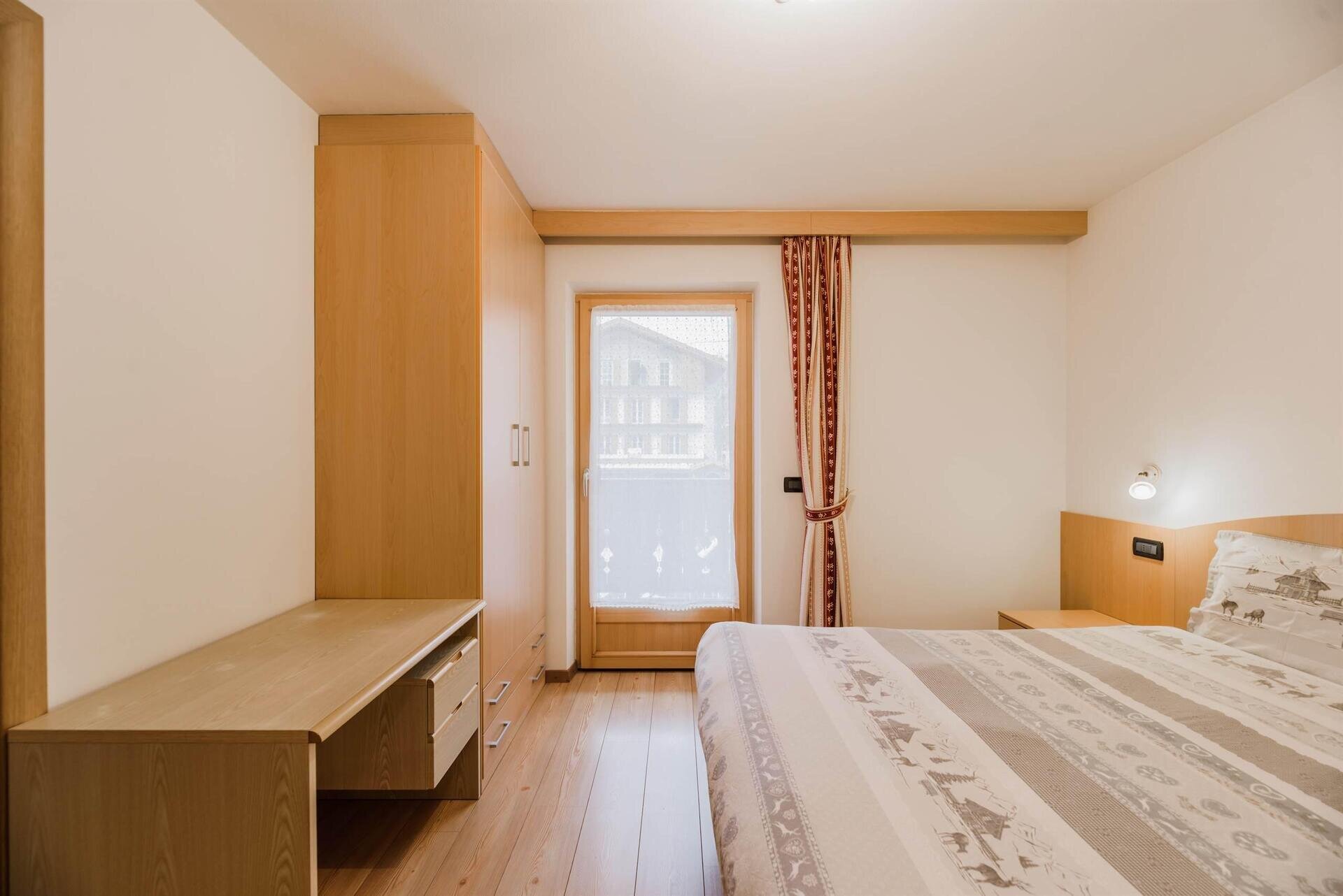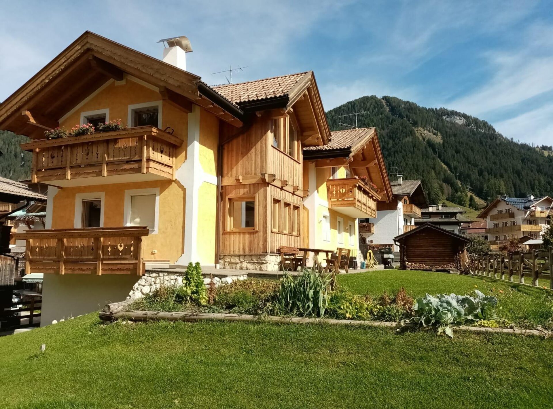 L'appartamento "Soreie" si trova lungo la bellissima Via Meida, in posizione soleggiata e panoramica, rientrato rispetto alla strada. Dal lato sud si ammirano Cima Undici e Cima Dodici, il bosco e la pista dell'Alloch che di notte viene illuminata. Dal lato nord si ha una splendida vista sul Gruppo del Larsech e sul Sassolungo. Dalla casa,