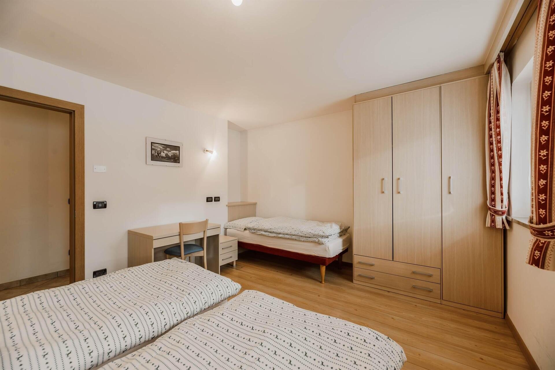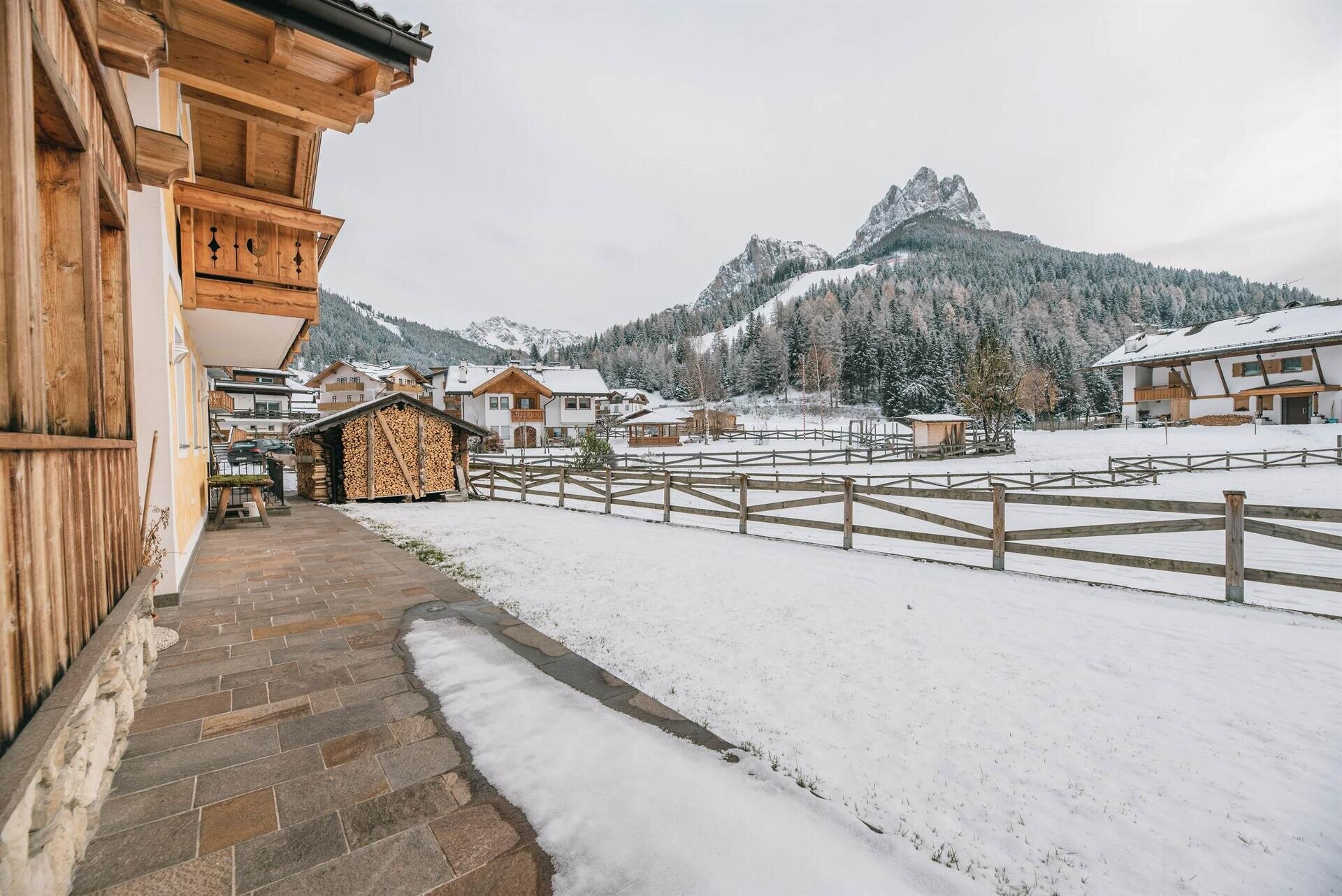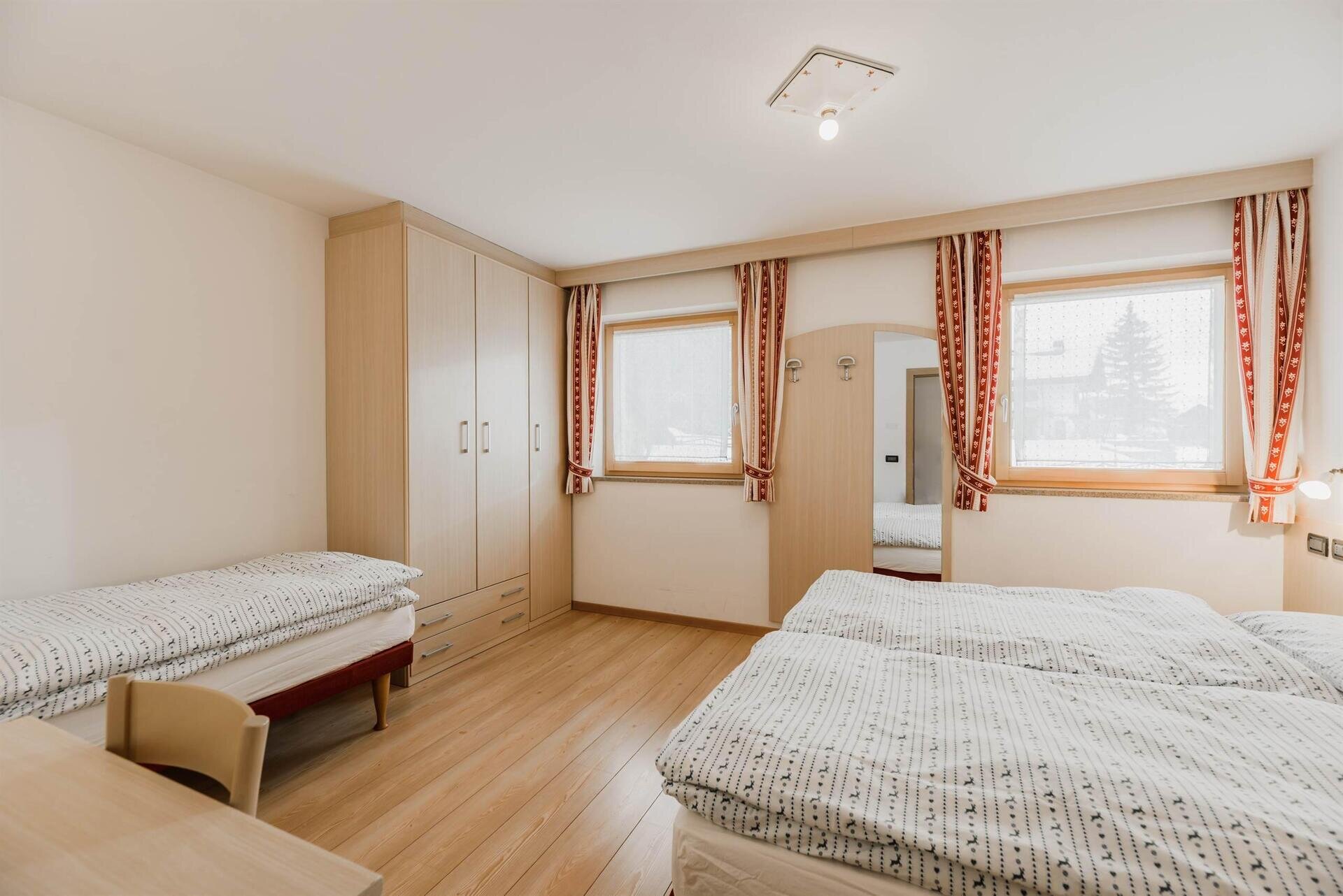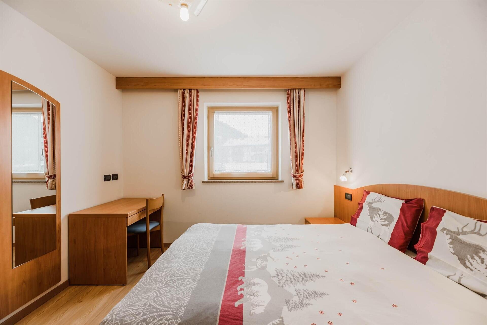 L'appartamento "Soreie" si trova lungo la bellissima Via Meida, in posizione soleggiata e panoramica, rientrato rispetto alla strada. Dal lato sud si ammirano Cima Undici e Cima Dodici, il bosco e la pista dell'Alloch che di notte viene illuminata. Dal lato nord si ha una splendida vista sul Gruppo del Larsech e sul Sassolungo. Dalla casa,