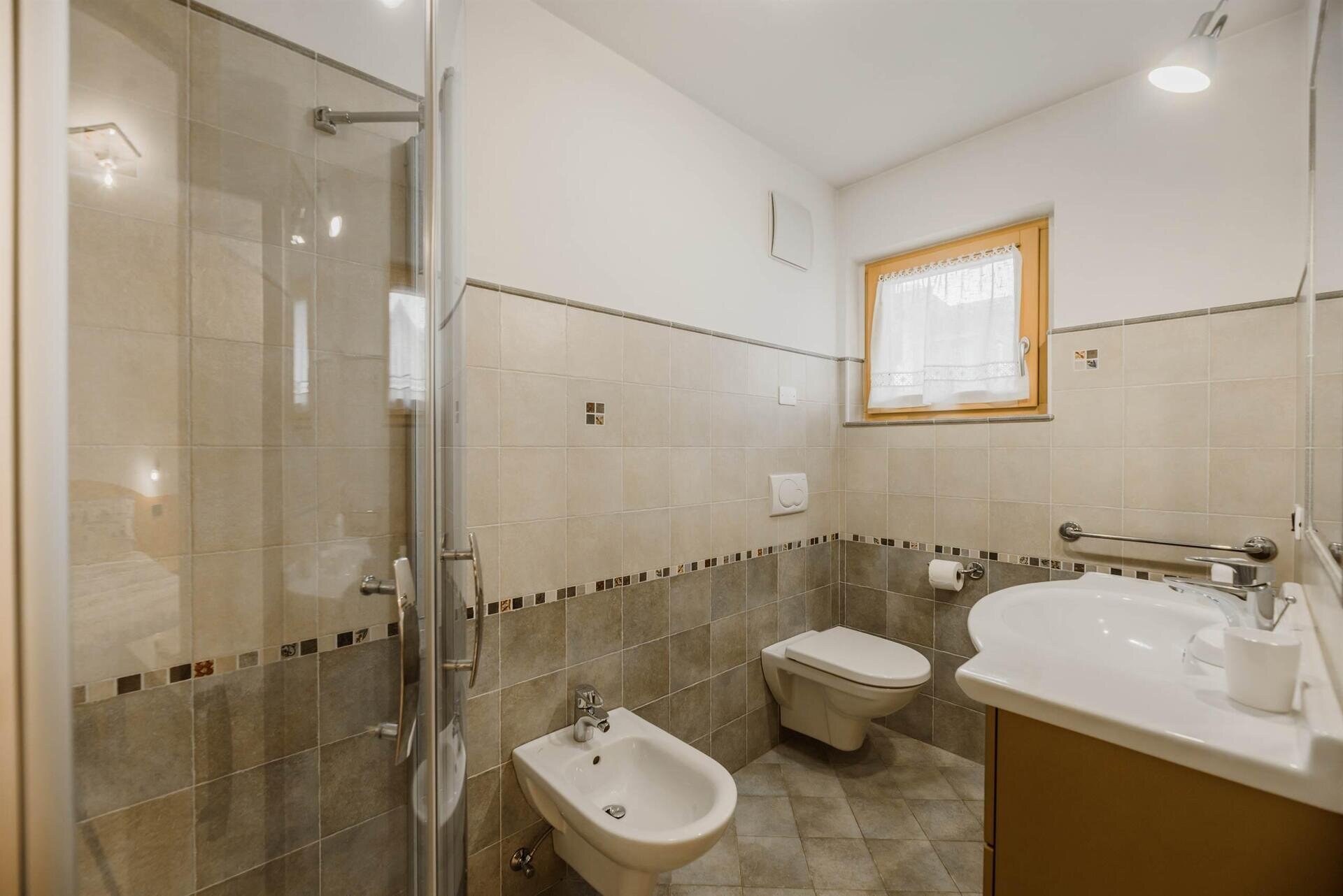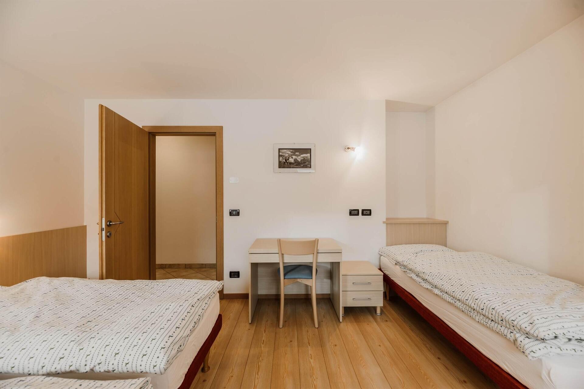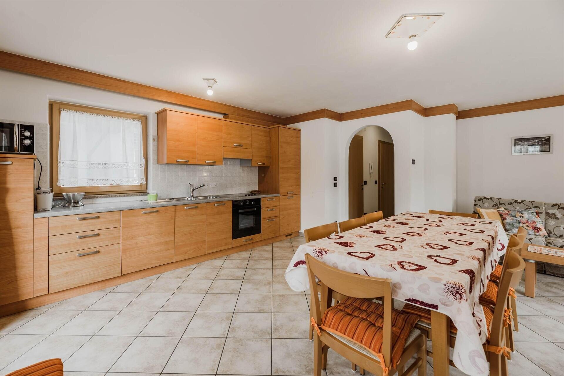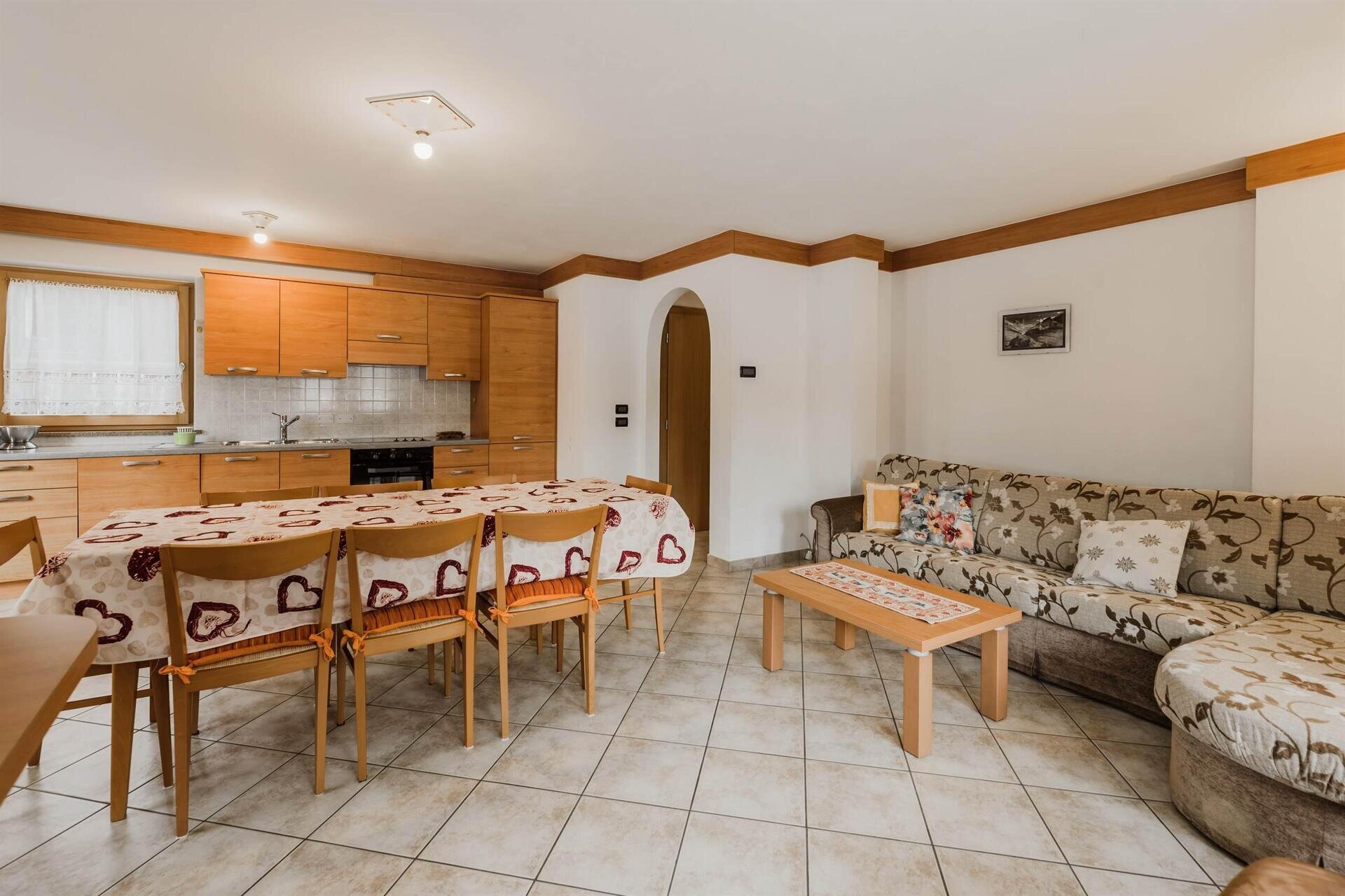 L'appartamento "Soreie" si trova lungo la bellissima Via Meida, in posizione soleggiata e panoramica, rientrato rispetto alla strada. Dal lato sud si ammirano Cima Undici e Cima Dodici, il bosco e la pista dell'Alloch che di notte viene illuminata. Dal lato nord si ha una splendida vista sul Gruppo del Larsech e sul Sassolungo. Dalla casa,